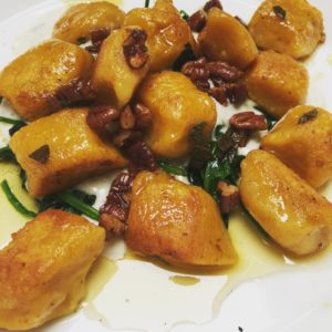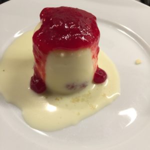 Het leek me wel een mooi idee om me voor dit diner te laten inspireren door mijn favoriete Kerstkookboeken. Al jaren maak ik met veel genoegen gebruik van Nigella’s Christmas en Feast (allebei van Nigella Lawson), en dit jaar heb ik 2 nieuwe boeken gekocht: Jamie’s Christmas (van de eeuwig aanwezige Jamie Oliver) en Gizzi’s Season’s Eatings (van Gizzi Erskine, mijn stijl- en kookicoon). Hoewel het geen Kerstdiner was, heb ik dus gerechten gekozen die in de decembersfeer pasten, wat wat mij betreft neerkomt op veel rood, kalkoen, spruitjes en wild, maar dan met een twist. Het voorgerecht was bietensoep met cranberries, en daarna aten we een salade van rauwe geschaafde spruitjes met amandelen en geroosterde amandelen, hutspot van winterpeen met koolraap, kalkoen met appel, kastanjes en salie, pappardelle met ragù van eend en mijn lievelingsgerecht van 2016: gnocchi van pompoen met salieboter, gorgonzolasaus en spinazie. En natuurlijk was er een dessert. Een van de december-repen van Tony’s Chocolonely is witte chocola met frambozen en knettersuiker, en het leek me wel een mooi plan om die na te maken als dessert, en wel in de vorm van een panna cotta van witte chocola met frambozen erin en frambozensaus erop. De knettersuiker had ik in de panna cotta gedaan, met nog een beetje eroverheen toen ik het serveerde. Ik was zelf heel erg tevreden met dit diner, maar dat was aanzienlijk minder belangrijk dan het feit dat H en haar vriendinnen het een succes vonden. Want daar doe ik het voor – en ik had er zoveel plezier in, dat ik mijn best ga doen om vaker een klus binnen te slepen!
