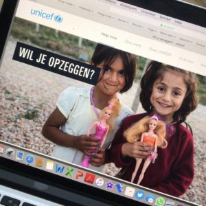 Ik hou daar dus niet van – ik geef liever één keer €50 dan 6 maanden lang €8**, maar ik snap ook wel waarom de goede doelen dat liever anders zien, want ze willen niet dat ik ze vergeet en ze willen wel dat ik vergeet om het af te zeggen. Niet omdat het nare, vervelende organisaties zijn die zoveel mogelijk pieken willen binnenharken, maar omdat ze een belangrijke taak vervullen, en belangrijke taken kosten geld. Dat begrijp ik, maar ik wil gewoon geen vaste relatie met een goed doel, dus ik had me voorgenomen om na 6 maanden mijn donateurschap te beëindigen, want dan had ik min of meer de €50 die ik liever gewoon in een keer had overgemaakt ook daadwerkelijk gegeven. Ik ging vol goede moed maar met minder enthousiasme over mezelf (je laat tenslotte toch de arme kinderen barsten) naar de website van Unicef, waar ik werd geconfronteerd met een grote berg emotionele chantage, vooral door middel van de foto op de ‘Wil je opzeggen?’-pagina – die twee schattige meisjes met die vieze Barbies wil niemand duperen tenslotte. Bovendien was de volgende horde dat je donatie verhogen prima via de website kan, maar om af te zeggen moest ik bellen. En ik haat bellen. Zeker als ik bel om te zeggen dat er namens mij geen PlumpyNut meer gestuurd kan worden. Maar ik heb het gedaan hoor, zodat ik nu weer geld heb vrijgemaakt om me door de volgende schattige leerling te laten noteren als donateur – zo ben ik dan ook wel weer.