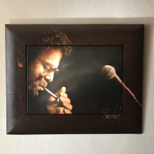 Toen mijn oma overleed heb ik een bescheiden bedrag mogen erven, en het leek me mooi om voor een deel van het bedrag iets moois te kopen (de rest heb ik keurig op een spaarrekening gezet). Omdat ik nog steeds regelmatig aan het schilderij van Lou Reed moest denken, ben ik op de website van Donkersloot gaan kijken. We hadden overigens nog steeds geen muur die groot genoeg was, maar het bloed kroop waar het niet gaan kon, en dat was maar goed ook, want ineens las ik ‘Een portret of schilderij op een ander formaat is ook mogelijk’. Ik heb gelijk contact opgenomen en Donkersloot heeft speciaal voor ons een Lou Reed van 1,5 meter breed gemaakt. Zonder dat Michel het wist heb ik het besteld en in Amsterdam opgehaald. Sindsdien hangt het in de woonkamer – als ik op de bank zit, zie ik Michel met zijn sigaret en daarachter zie ik Lou Reed. Ik kan me geen mooier uitzicht voorstellen.