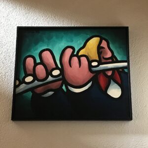 Ik was degene die Barry Blend ontdekt had – althans, ik was degene die als eerste van de familie zijn galerie binnenwandelde. Daarom vond ik eigenlijk dat ik recht had op een schilderij van hem, en mijn ouders gunden mij dat ook wel, maar ik moest het eerst verdienen. In 1993 ging ik studeren en rond 1998 gaf mijn vader, die toen al veel in Frankrijk was, Blend opdracht om voor mij een dwarsfluitist te schilderen (ik heb heel lang dwarsfluit gespeeld, dus die muzikant paste het beste bij mij). Het duurde echter nog wel even voordat ik afstudeerde; mijn vader had het er regelmatig over dat mijn Barry Blend inmiddels een soort Rembrandt was geworden, omdat ik maar niet over de brug kwam met die bul. Maar goed, uiteindelijk heb ik hem gekregen. Mijn ‘Man met de dwarsfluit’ hangt op een muur bij de trap. Hij is niet heel erg goed te zien, maar ik weet dat hij er hangt en ik ken zijn geschiedenis. Het was een mooi cadeau en ik vind het ook een heel goed geschenk voor iemand die afstudeert – een schilderij dat je associeert met je jeugd past wel in zo’n rite de passage.