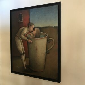 Het is eenieder die alle afleveringen van het thuismuseum heeft gelezen misschien opgevallen dat zo goed als alles wat hier in huis aan kunst staat of hangt door mij is uitgezocht, aangeschaft of geregeld door het bij mijn familie los te terroriseren, dus het leek me niet dat ik in mijn recht zou staan als ik Michel zou misgunnen om een schilderij te kopen dat hij heel erg mooi vond en van zijn eigen geld wilde aanschaffen. Bovendien vond, en vind, ik het ook helemaal niet erg om naar de Breuvage amoureux (het liefdesdrankje) te kijken. Hij heeft het gekocht en sindsdien hangt het onderaan de trap, op een voor visite misschien niet zo opvallende plek, maar wij zien het elke keer als we van boven naar beneden gaan. Uit de emailcorrespondentie die Michel met Cyril Desmet, de schilder, heeft gevoerd, blijkt dat Michel er een bijna middeleeuwse charme in ziet, en ik deel dat wel – ik snap niet precies wat die mevrouw in die enorme theekop doet, maar dat maakt het alleen maar interessanter om naar te kijken, en het verhaal verzin ik zelf wel. Michel heeft op een zaterdag later in 2014 in de galerie waar hij de Breuvage gekocht heeft met Desmet gesproken. Ook daar was ik niet bij, want ik was weer in Amsterdam. Ik heb door die opleiding al met al best veel gemist, maar ach, ik kan mijn tenen aanraken en op mijn hoofd staan (niet tegelijkertijd), en als ik op de bank zit, zie ik het schilderij, dus misschien ben ik er al met al wel als winnaar uitgekomen.