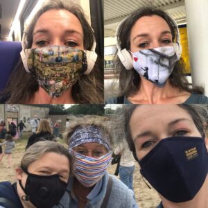 ** De dames naast mij zijn Antje, die een heel goed masker met neusbeugel, afsluiting onderaan en een filter showt, en Francien, die een mondmasker heeft van een vrouwennijverheidsgroep. Op zich leuk hoe iedereen er een eigen twist aan geeft.