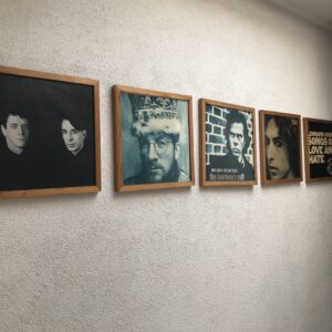 In 2000 bezochten Michel en ik een overzichtstentoonstelling in het Groninger Museum van Anton Corbijn, en die tentoonstelling was om meerdere redenen prachtig. Om te beginnen natuurlijk de onderwerpen die Corbijn fotografeert, want dat zijn vooral musici, en dan van alle musici eigenlijk verrassend vaak de musici van wie wij fan zijn. Er was een zaaltje waar de clips waaraan Corbijn heeft meegewerkt werden gedraaid, dus we konden zelfs genieten van de muziek waar we al aan moesten denken toen de de foto’s zagen, dus dat was ook heel fijn, maar het allermooiste waren misschien nog wel de ingelijste LPs. Dat wilden wij ook wel in ons huis (we woonden toen nog heel klein, maar we waren op zoek naar een nieuw huis, waar zeker ruimte aan de muur zou zijn voor alle kunst die we zouden willen hebben), dus we hadden goede hoop voor het aanbod in de winkel van het museum. Helaas – er lagen catalogi en andere Corbijn-gadgets, maar geen hoezen voor onze platen. Gelukkig had onze vriend Wouter een jongere broer die timmerman was, en hij heeft voor ons 5 eenvoudige lijstjes gemaakt. We hingen ze meteen op in ons nieuwe huis – in het begin was het een wisseltentoonstelling (Kerstplaten met Kerst, een themawand als er weer eens een held was overleden), maar de 5 platen die op bovenstaande foto te zien zijn, hangen er al jaren. De foto in het midden, van Nick Cave, is overigens gemaakt door Anton Corbijn. We hebben nog wel meer collector’s items, qua platen, bijvoorbeeld een exemplaar van Sticky Fingers van The Rolling Stones (ontworpen door Andy Warhol), maar die hangen we niet op, want het zou zonde zijn als die teveel zon zou krijgen.