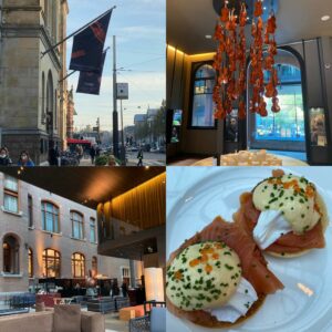 Vaak is het zo dat ik, als ik me ergens heel erg op verheug, eigenlijk gegarandeerd een teleurstelling voor mezelf in scène zet, want het is nooit zo geweldig als ik denk dat het wordt, en hoewel er in het Conservatorium-hotel hier en daar iets mis ging (de kamer die we kregen was op het laatste moment gewijzigd, waardoor er nadat we er waren ingecheckt nog wat aan moest gebeuren), was het al met al precies zo geweldig als ik dacht dat het zou worden. Toen de verwarring met betrekking tot de kamer aan het licht was gekomen mochten we in de bar wachten, met een biertje voor Michel en een mooie witte wijn voor mij, dus dan heeft het weinig zin om boos te blijven, en bovendien was iedereen, van de meneer bij de deur tot de man bij de receptie, zo ontzettend vriendelijk en attent dat je wel een hele nare diva moet zijn om moeilijk te doen. In onze hotelkamer, die uit 2 verdiepingen bestond, hadden we twee badkamers, allebei met zalige doucheproducten, en maar liefst drie televisies (een per verdieping en een in de spiegel van de badkamer met het ligbad). We konden onze eigen muziek draaien via een bluetooth speaker, het ontbijt was heerlijk (met een ruime keuze aan prachtige gerechten) en er bleek een late check-out beschikbaar voor ons, dus we hebben optimaal van de kamer genoten. Ik geloof niet dat ik verder zal zeggen dat corona mij veel positiefs heeft gebracht, maar dit vinkje op de awesome-lijst heb ik aan de pandemie te danken!