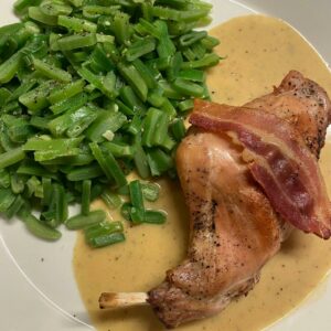 Maar soms doe ik een beetje extra mijn best. Daar kunnen verschillende redenen voor zijn: dat ik een ingrediënt heb gekocht dat ik nog nooit heb bereid en dat ik wel een keer zou willen proberen, dat Michel iets aanvraagt of dat ik ineens uit het niets totaal gegrepen raak door iets dat ik in een kookboek gezien heb en een keer wil proberen. Zo vroeg Michel vorige week of ik eigenlijk weleens gehaktballen had gemaakt, en dat had ik eerlijk gezegd nog nooit gedaan, deels doordat de Hollandse keuken me niet zo heel veel kan boeien en deels doordat ik bang ben dat die dingen uit elkaar vallen en ik dan gewoon een pan vol gehakt heb. Een kwartiertje recepten op internet vergelijken bracht me tot de gehaktballen van Jonnie Boer, die niet in de Librije op de kaart staan maar wel een vast onderdeel zijn van het personeelseten. Ik moet zeggen: het was in een keer goed. En omdat ik zo tevreden was over het koken met recepten ben ik de volgende dag aan de slag gegaan met de konijnenbouten die ik op verzoek van Michel had besteld en bereidde ik ‘rabbit à la moutarde’, keurig volgens de instructies van Gizzi Erskine (mijn stijl- en kookicoon, zelfs nog meer dan Nigella Lawson), te vinden in haar nieuwe boek ‘Restore‘. Ook dit was gewoon heel goed gelukt, dus misschien ga ik deze lockdown gebruiken om wat vaker uit mijn culinaire comfort zone te gaan. Volgens mij zijn daarbij alleen maar winnaars!