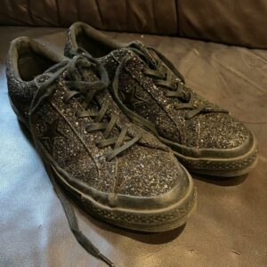 Een van de projecten van 2021 is elke week 5 dingen weggeven op mijn ‘Susannah geeft het weg‘-Insta. Ik ben inmiddels lekker van start gegaan – het is nu week 4, maar de spullen gaan op zondag online, dus vooralsnog heb ik 15 dingen op de site gezet. Nou ja, technisch gezien 19, want er zaten 2 paar schoenen bij en een bescheiden kaveltje sieraden (een ring en een paar oorbellen), maar ik tel de posts. In week 1 postte ik 2 kookboeken, 2 jurken en een paar glittersneakers, in week 2 nog eens 2 kookboeken, een flesje parfum, een jurk en een paar laarzen, en gisteren een boek, de sieraden, een legging, een tas en een jurk. En ik ben heel trots, want bijna alles is weg: 14 van de 15 items zijn geclaimd, opgehaald, verstuurd of liggen hier te wachten tot ik de rol bruin papier die ik online heb moeten bestellen omdat ik nergens een winkel kan vinden die dat verkoopt en open is binnen heb. Het enige wat ik nog niet heb kunnen slijten is het paar zwarte glittersneakers van Converse, en dat verbaast me op zich wel een beetje, want ik heb maat 39, net als een groot deel van de rest van de wereld, ze zijn van een behoorlijk bekend merk, ze verkeren nog in prima staat en, en laten we niet doen alsof dat onbelangrijk is, het zijn zwarte glittersneakers, perfect voor iedereen die tegelijkertijd een positieve en een gothic uitstraling wil hebben.