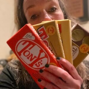 Ik heb een warme relatie met Tony’s Chocolonely. Die is lang geleden begonnen, toen Bas op dieet was en ergens had gelezen of gehoord dat pure chocolade goed was voor de gezondheid, zodat hij altijd een reep in een blauw papiertje bij zich had, waar ik dan ook een stukje van kreeg – want al heeft hij het dieet maar 10 minuten volgehouden, die chocola bleef, en toen hij tijdelijk naar Zuid-Afrika emigreerde liet hij voor mij 6 repen achter (wat het gemis niet kleiner, maar op zich wel draaglijker maakte). Sindsdien is er wat mij betreft maar een merk chocola voor me. Het is natuurlijk fantastisch dat het superverantwoorde chocola is, zodat ik bij elk stukje dat ik in mijn hoofd steek bijdraag aan een wereld zonder armoede, moderne slavernij en kinderarbeid, maar als ik eerlijk ben helpt het wel heel erg dat dat stukje dat ik in mijn hoofd steek ook zo lekker is. Ik ben vooral een sucker voor de limited editions, want ik vind het leuk als iets tijdelijk is, omdat ik er dan meer van geniet. De pure chocola met fudge en roze peper was een favoriet, maar ik denk vooral met weemoed terug aan de melkchocolade met popcorn en discodip en aan de melkchocolade met cola. En dan mag destijds de tijdelijkheid juist een factor zijn die die repen extra aantrekkelijk maakte, inmiddels zou ik er een lief ding voor over hebben om die smaken weer eens in mijn keukenkastje aan te mogen treffen.