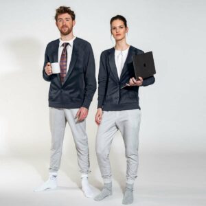 Als ik een dagje achter de laptop doorbreng, wil ik kleren aan waarin ik de hele dag lekker kan zitten, dus niet al te strak rond mijn middel, zeker nu het koud is is warmte een belangrijke factor, persoonlijk vind ik zachte stoffen prettiger dan stijf materiaal en het moet er vooral aan de bovenkant een beetje fatsoenlijk uitzien. Ik kan wel een spectaculaire rok aantrekken, maar uiteindelijk ziet niemand mijn onderlijf, dus dat heeft alleen maar zin als ik vervolgens een foto van mijn outfit op Instagram zet. Dus ik zorg ervoor dat er in elk geval iets interessants te zien is als ik met mijn kop in beeld kom: een mooie trui (soms zelfs met print), een fraaie ketting of mooie oorbellen. Of al die dingen. Wat ik sowieso heel prettig vind om aan te trekken voor weer een dag in de Zoom, is een jumpsuit, want zo’n jongen voldoet aan alle eisen, en het enige wat onhandig is aan een jumpsuit (dat je je zo’n beetje helemaal moet uitkleden als je naar het toilet wilt) is helemaal niet zo’n probleem als je in je eigen huis bent. Maar ik wil toch ook wel even een speciale lans breken voor de ‘Thuiswerk truien‘ van de firma Snurk, want toen ik die tegenkwam moest ik hardop lachen. Dat is pas een mooie manier om een professionele uitstraling met corona-comfort te combineren. Fijn om te zien dat de creativiteit in elk geval niet tegelijk met ons sociaal leven is komen te overlijden!