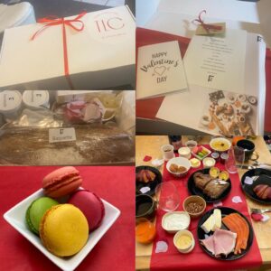 En het was een mooie brunch. Hij werd aan huis bezorgd (natuurlijk voor een meerprijs) door een heel aardige jongen, en het geheel zat in een mooie doos met een rood lint erom. Het was sowieso allemaal heel goed verzorgd, met rood vloeipapier om het af te dekken en in ons geval ook om als tafelloper te gebruiken, en met een zakje nepbloemblaadjes om het geheel een romantische uitstraling te geven. Alle gerechtjes zaten in mooie doosjes, er zat een Valentijnskaartje bij (‘Dikke kus, François Geurds en team’) en een opwarminstructie voor een aantal onderdelen die nog even afgebakken moesten worden. Dat gold voor de baguette en de croissants, die voor een deel roze waren, maar gelukkig niet te zoet smaakten, en de quiches en de pancakes (die niet plat waren, dus ik zag er geen pancake in – ze waren wel heel lekker overigens). Sommige dingen in de box waren gewoon: de brie en de boerenham waren gewoon brie en boerenham. Sommige dingen waren speciaal: ik eet anders nooit algenboter, de quiches waren zalig, en de hangop met granola was de lekkerste hangop met granola die ik ooit heb gegeten. Maar sommige dingen zullen we ons nog lang heugen: het sinaasappel-wortel-gember-limoen-sap smaakte supergezond, de gemarineerde meloen was fantastisch en ik heb toen we de brunch hadden afgerond wat er over was van de karamelsaus voor bij de pancakes moeten weggooien om te voorkomen dat ik hem ging leegdrinken. En dan hadden we voor later nog 4 prachtige macarons en een reep chocolade. Ik hoop meer dan van harte dat Michel en ik de volgende Valentijnsdag ergens buiten de deur kunnen vieren, maar als het zo moet, dan hou ik het ook nog wel een jaartje vol!
