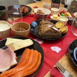 Overigens hoef ik op 14 februari van Michel niks te verwachten. Hij heeft helemaal geen middle name en houdt sowieso niet van sentimentele feestdagen. Dat neem ik hem niet kwalijk, als ik bloemen wil koop ik ze wel voor mezelf en bovendien heeft hij de afgelopen weken geen stap buiten de deur gezet waar ik niet naast liep, want we doen alles samen. Dan wordt het voor iemand die niet online winkelt lastig om met verrassingen over de brug te komen. Maar dat is geen probleem, want ik hoef dan ook niet bang te zijn dat we allebei iets organiseren dat in de praktijk conflicteert – wat ik organiseer is het plan, en als dat een etentje buiten de deur is, wil hij zelfs meestal de knip trekken (mijn favoriete verrassing). Dit jaar konden we nergens heen, maar ik had bij FG Restaurant een Valentijnsbrunchbox besteld, en dat was een perfecte afwisseling van het gebruikelijke weekend: we hadden lekker brood, croissantjes, jam, algenboter, fruitsap, speciale thee, ham, brie, gerookte zalm, pancakes met fantastische karamelsaus, hangop met granola, gemarineerde meloen, roomkaas, chocoladepasta, eiersalade, quiche, macarons en een reep chocolade toe. Ik zou mezelf niet zijn als ik daar niet ook een halfje roze champagne naast zou hebben gezet, en toen we vanmiddag om 14.00 (het moment dat ons het beste uitkwam – op zich helemaal niet erg om je programma lekker zelf in te vullen) aan de met rozenblaadjes (die werden ook meegeleverd) bestrooide tafel gingen, waren we in het perfecte gezelschap: degene met wie wij allebei het liefst dingen doen. Toch nog een beetje romantiek in corona-tijd!