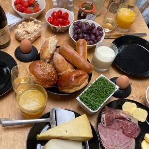 Wat echt feest was, was de Paasbrunchbox van de Lindenhoff. Anders dan de Valentijnsbox van FG, waarin allerlei producten zaten die in François Geurds zijn sterrenkeuken waren bereid, kregen we van de Lindenhoff vooral materialen om zelf iets mee te maken. Geen probleem, want ik kan koken, dus we konden kiezen tussen gekookte of gebakken (of scrambled of gepocheerd natuurlijk) eieren, en we hebben een citruspers, dus een netje perssinaasappelen was precies wat we nodig hadden. Verder hadden we geweldige zalmsalade, prachtige lamsham, heerlijke geitenkaas en voortreffelijke truffelkaas, allemaal in ruim bemeten porties (de kaas hebben we nog steeds in roulatie). Er waren druiven, cherrytomaatjes en tuinkers. Wij zijn niet zo van het zoete broodbeleg, maar de Lindenhoff had rekening gehouden met wie dat wel is, want we hadden een potje pruimenjam. Qua brood hadden we afbakbreekbrood, briochebollen en worstenbroodjes die alleen maar in de oven opgepiept hoefden te worden, en natuurlijk een mooi stuk boter. We hebben even getwijfeld over of we deze box wel wilden bestellen, want hij was voor vier personen, en wij zijn maar met zijn tweeën, maar ach, er zijn twee Paasdagen, dus dat leek ons wel te verantwoorden. We dronken er een mooie bubbel bij, een Riesling van de Apostelhoeve, en het was al met al eigenlijk een prachtige manier om samen, volledig corona-proof, Pasen te vieren. Ik heb alleen geen chocolade-eitjes gevonden hier in huis. Zou de Paashaas ze dan dit jaar dan toch onvindbaar verstopt hebben?
