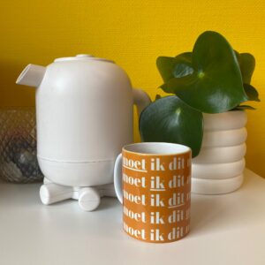 Ik streef er op zich niet naar om een influencer te worden, maar toen de Fotofabriek contact met me opnam en me aanbood dat ik op hun kosten een mok met een foto mocht laten bedrukken, was ik eigenlijk wel heel enthousiast, vooral omdat ik een nogal intensieve thee- en koffiedrinker ben en altijd wel een nieuwe mok kan gebruiken. Het langst heb ik erover gedaan om een afbeelding te vinden om op de mok te zetten, want ik kan helemaal niet zo goed kiezen tussen vakantiefoto’s uit het verleden (een herinnering naar de reis naar IJsland kan ik altijd op mijn netvlies gebruiken), een collage van foto’s van vrienden en vriendinnen (dan denk ik ook aan ze tijdens gigadrukke werktijden – maar ja, ik wil ook niemand vergeten) of misschien een inspirerende tekst. Die laatste is het geworden, want ik blijf een woordenvrouw, en ik heb gekozen voor een tekst uit een cursus van Structuurjunkie, ‘Moet ik dat nu doen?’ met elke keer een ander woord onderstreept. Toen ik de keuze eindelijk gemaakt had, ging het supersnel: op maandagochtend heb ik de afbeelding en de mok gecombineerd en ben ik tot bestelling overgegaan, en op dinsdagmiddag, een kleine 30 uur later, heb ik de mok in ontvangst genomen. Hij was precies zoals ik me had voorgesteld, en ik heb er heel veel zin in om het komende schooljaar elke dag een kopje thee te drinken uit deze reminder van mijn plan om een beetje meer balans in mijn leven te hebben!
