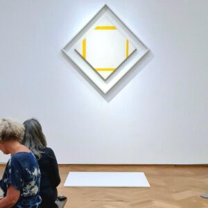 Het programma verliep in verschillende fases: als eerste stelden de deelnemers (6 vrouwen) zich aan elkaar voor aan de hand van een kunstwerk, en daarna gingen we op zoek naar een ander kunstwerk om daarmee aan de slag te gaan aan de hand van onze eigen van tevoren opgestelde vraag. Dat kunstwerk moesten we kiezen op een tentoonstelling over Mondriaan – een kunstenaar waar ik niet zo heel erg fan van ben, dus ik moest even iets opzij zetten. Maar toen ik dat eenmaal had gedaan heb ik met ontzettend veel enthousiasme ongeveer een uur doorgebracht voor wat ik alleen maar kan beschrijven als het meest Mondriaanse kunstwerk van alle Mondriaanse kunstwerken: 4 gele lijnen op een gekanteld wit doek. En door de stapsgewijze opzet van het programma kwam ik zowaar aan de hand van die 4 lijnen tot een antwoord op mijn vraag. Sterker nog, ik was zo enthousiast over het antwoord dat ik samen met mijn nieuwe beste vriend Piet M. had geformuleerd, dat ik echt zin had om weer aan het werk te gaan. Ik was overigens ook trots op mezelf, want waar ik meestal heel beweeglijk ben in een museum, heb ik nu echt de tijd genomen om te kijken, te beschrijven en te denken. Al met al was het dus een ontzettend prettige en leerzame manier om aan de hand van kunst in alle rust eens even na te denken over iets wat belangrijk is voor mij. Dat zou ik vaker moeten doen. En andere mensen overigens ook.