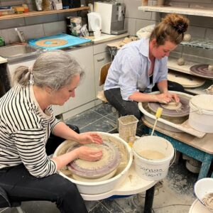 Waar ik mezelf op zich best als creatief zou omschrijven, zit die creativiteit niet in de kunstzinnige hoek. Ik kan een beetje tekenen (na daar een cursus voor te hebben gevolgd), maar dat is tekenen om even snel in beeld iets uit te drukken, ik kan helemaal niet toneelspelen, tenzij ik zozeer word getypecast dat het geen toneelspelen meer is en niemand wil mij horen zingen of zien dansen. Ik heb ooit een workshop beeldhouwen gedaan, en hoewel ik dat heel erg leuk vond, was ik er niet goed in. Ik kan heel prima koken, maar ik ervaar dat niet als creativiteit, meer als een soort kunde. Mijn creativiteit zit eerder in woorden, in slimme zinnen maken, stevige teksten schrijven en heel veel praten, al dan niet op een podium. Maar omdat het zelden een slecht idee is om een beetje buiten de comfort zone te treden en even met de handen te werken, neem ik elk jaar op als een van de 47 dingen dat ik een workshop op creatief gebied wil doen. Dit jaar had ik het slim aangepakt, want ik wilde niet alleen gaan, dus ik gaf Martine voor haar verjaardag een workshop pottenbakken voor twee personen, en vertelde haar dat ik de tweede persoon was. Een beetje freestyle kleien was natuurlijk te makkelijk, want als de lat niet idioot hoog ligt heb ik geen interesse in de lat, dus het was een workshop pottenpakken met de draaischijf geworden, en wel bij het prachtig genaamde blubber en glas in Leiden.